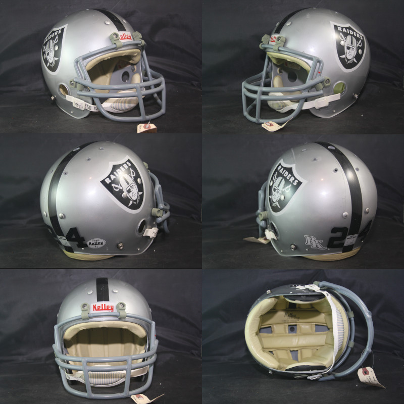 Have you ever seen another one? Bill Kelley very rare Oakland Raiders 100MH Clear Shell Helmet. Kelley took over the popular MacGregor helmet line, with his helmets virtually identical to the clear shell MacGregor 100MH model helmets. We have been doing this a long time - over 30 years, and we have only seen one other Raiders Kelley clear shell helmet from this era. If you collect helmets, you know how rare Raiders helmets are in the collectible market. They bring top dollar, are highly sought after, and when purchased by a collector - they never resurface. This helmet is in pristine, museum quality condition from the mint condition interior, to the mask, the slight wear on the exterior, the iconic logos, and the included rare Kelley chinstrap.