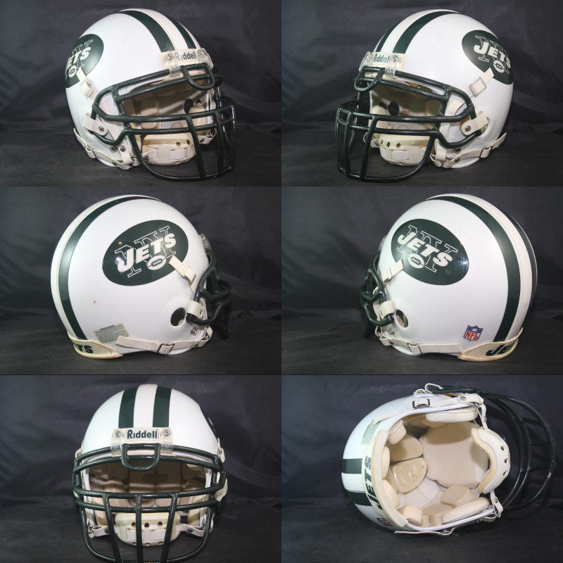Game Used, worn 2000 New York Jets Riddell VSR4 model helmet. The helmet was manufactured in 2000 and all indications are that it was only used for that season and then released/kept, etc. The helmet is dated 2000, the facemask is dated 2000, there are no reconditioning stickers on the interior of the helmet, nor is there an American Flag decal on the rear that the NFL started wearing in September of 2001. The helmet is in excellent display condition exhibiting light to moderate wear on the exterior with moderate to heavy wear on the mask as well as the interior of the helmet. The helmet interior padding includes some small holes that appear to be punched into the crown liner - perhaps when released to prevent the helmet from being worn or used again.