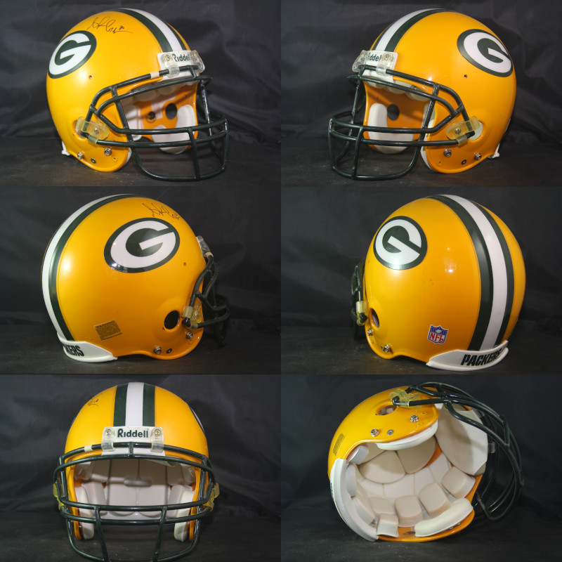 2000 Green Bay Packers Game Worn Used football helmet. The helmet is a Riddell VSR4 model in a large size. The helmet came directly from the Green Bay Packers. The helmet is complete and original as sourced to us.