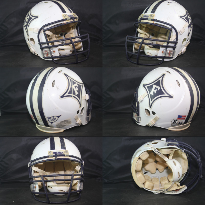 The helmet is a white color and is complete with all of the decals, including the FURMAN front bumper, the team warning label, American flag and Felton's #45 identifier on the rear of the helmet. The logos, decals, and striping is in game used condition with heavy wear, yet adhered to the helmet very well.