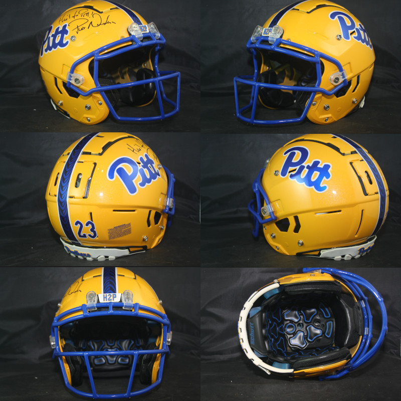 Game used, worn Pitt Panthers helmet last used during the 2023 season. The helmet is signed by Pitt Head Coach Pat Narduzzi on the front in bold, crisp, black sharpie. The helmet is original, complete, and unaltered or modified in any way.