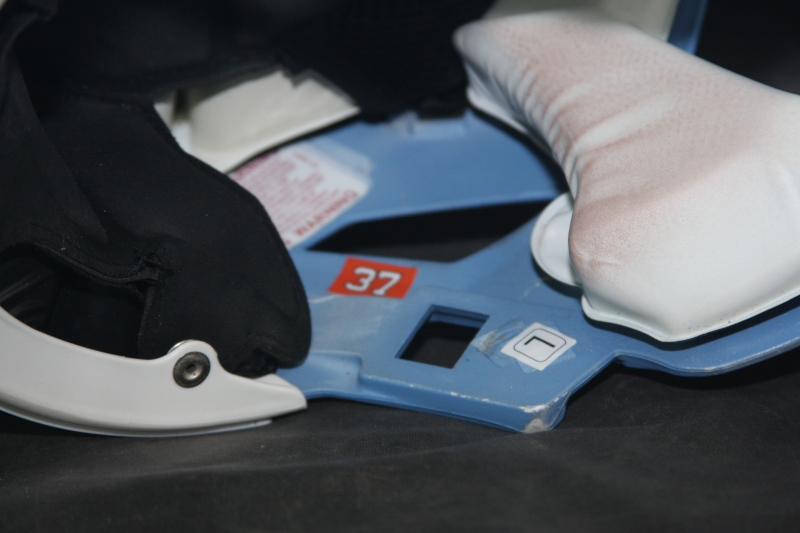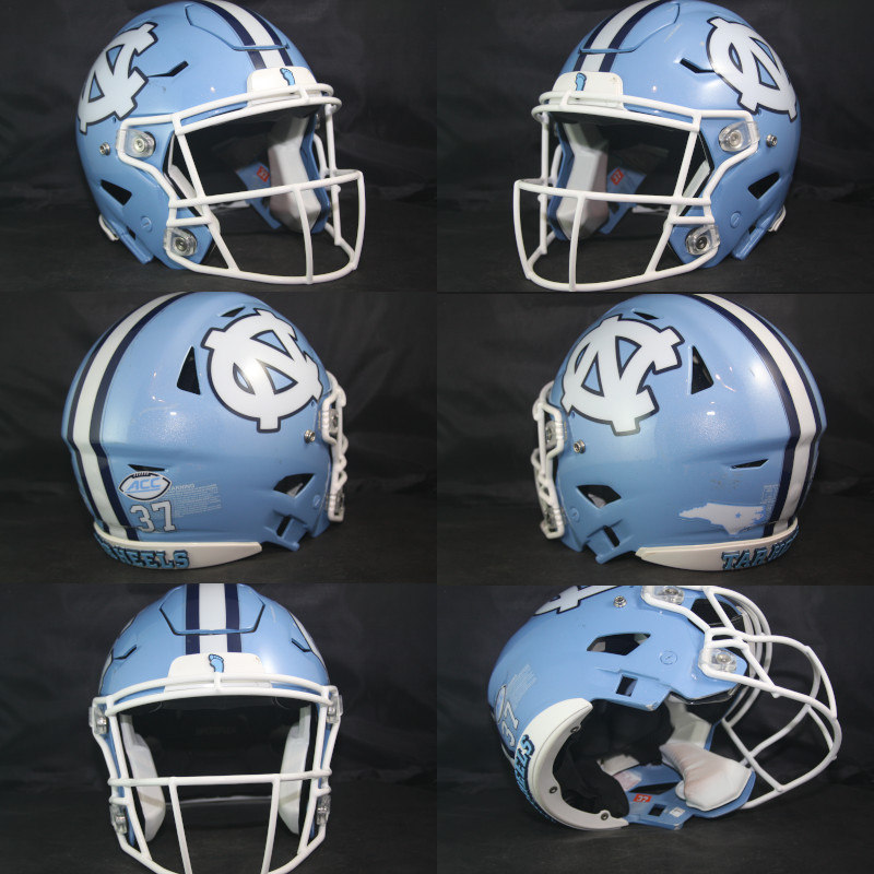 The striping and side logos on the helmet are original, adhered well to the helmet, and positioned properly - matched to the positioning on photos of UNC helmets during the 2024 season. The center stripe is a multi-stripe that the team uses. The facemask is a Riddell Speed Flex model, secured to the helmet with its original clips and quick disconnect fasteners at the top and side locations of the mask. Game decals include the team applied white on clear warning labe, front and rear 3D bumper decals, ACC Decal, State of NC decal, and a #37 player identifier. Jack Blythe, a redshirt Freshman defensive back wore #37 for the Heels in 2024. There is a #37 identifier on the interior of the helmet, on each side of the helmet near the earhole, which aligns with the 37 on the rear of the helmet.