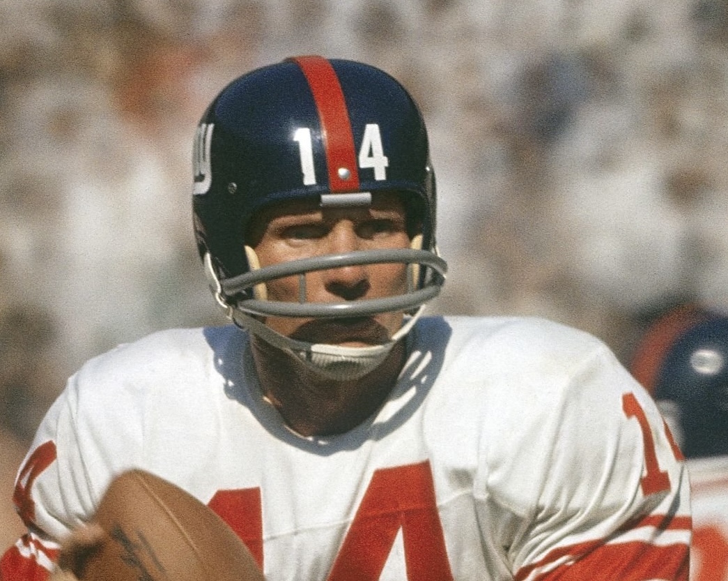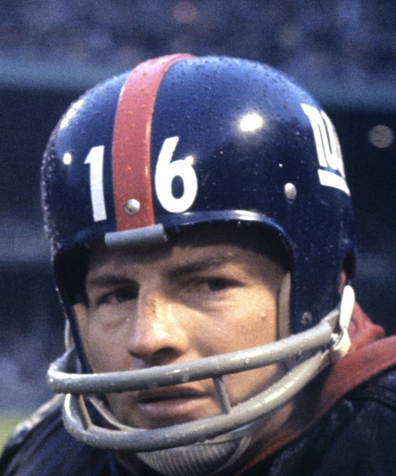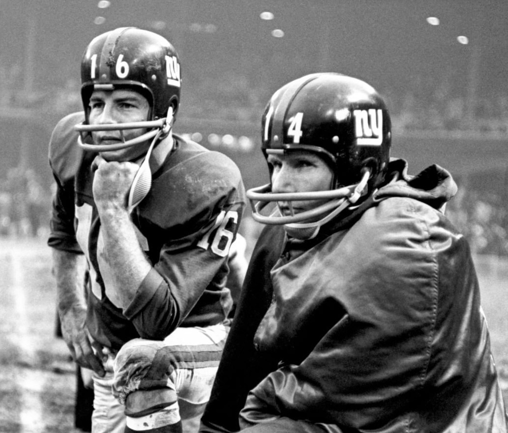 1964 New York Giants Riddell RK4 Suspension helmet. The helmet was never used, never had a mask installed to it, and remains in excellent condition - with the only marks being from moving it around for the past 60 years. This Giants helmet, like all early 1960s Giants helmets, has a factory painted center stripe. Not a vinyl decal, but painted. The helmet is all original and complete, unmodified in any way. The original rare model helmet comes complete with the 6-point suspension, leather jaw pads, 1964 date stamp, factory stickers on the inside, and the clear crisp Riddell heat stamps on the lower rear. Simply stunning.