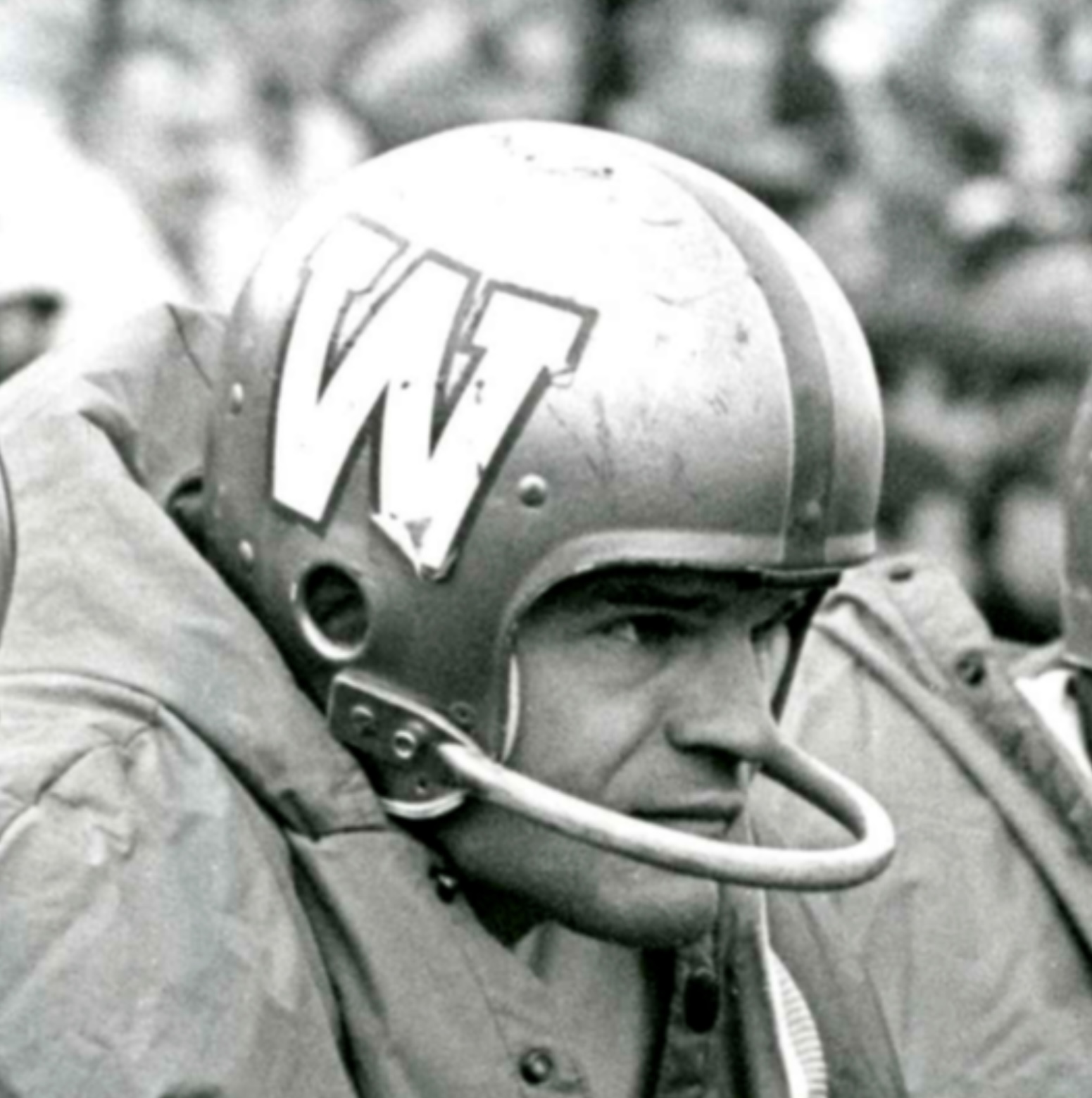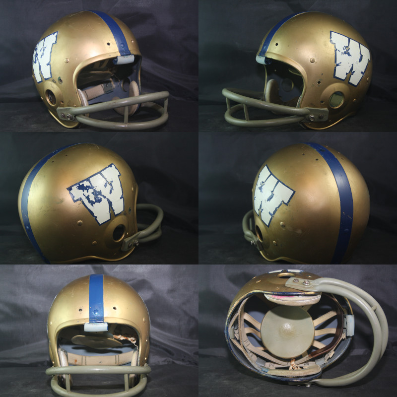 The Blue Bombers wore this style of helmet with the blue center stripe and these logos from 1965 through the 1969 season, although it could be older than the 1965 season - with no datecode found in the helmet. The helmet is original, unaltered, and complete except the chinstrap. The center stripe of the helmet is painted rather than a vinyl strip used by other teams and later by the Bombers. The logos are two-part multiple layers with the white "W" on top of the navy background. There is significant chipping to the edges of the white "W" on each side of the helmet - adding to the character, uniqueness, and the story of this rare helmet.