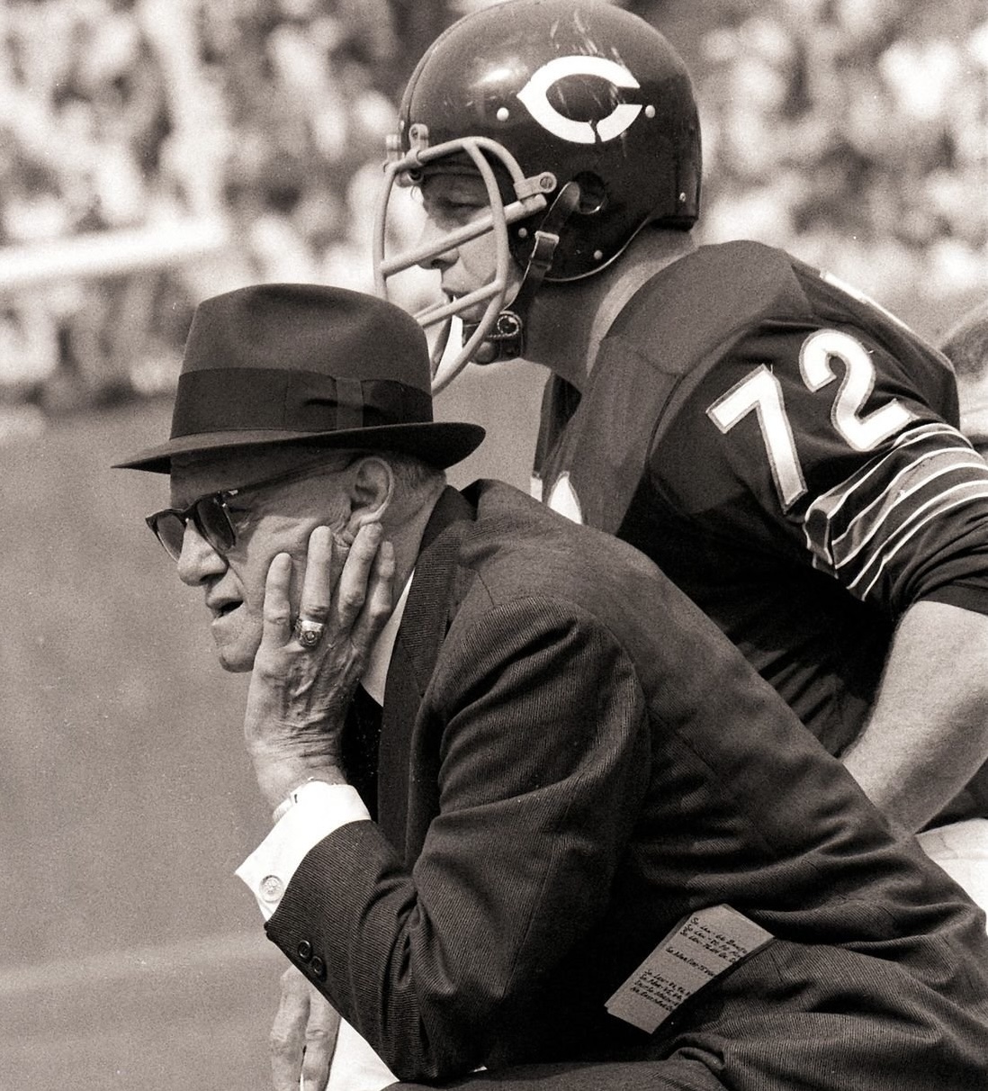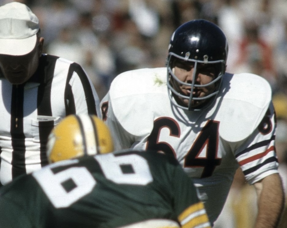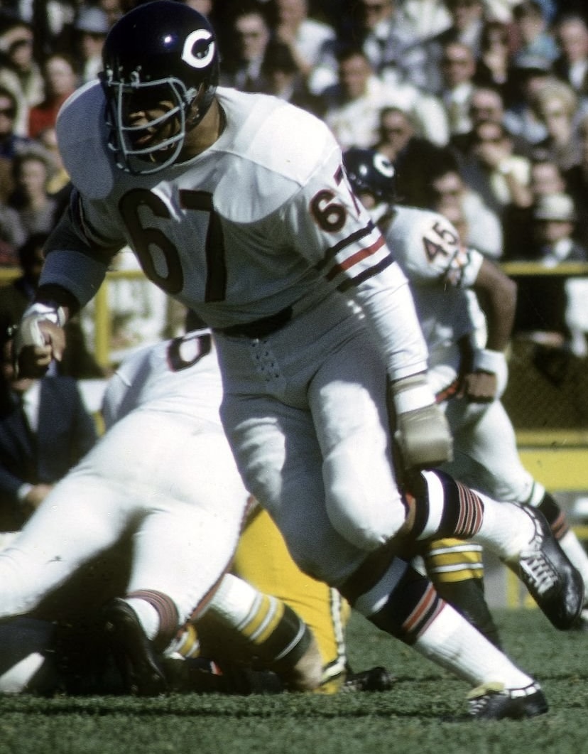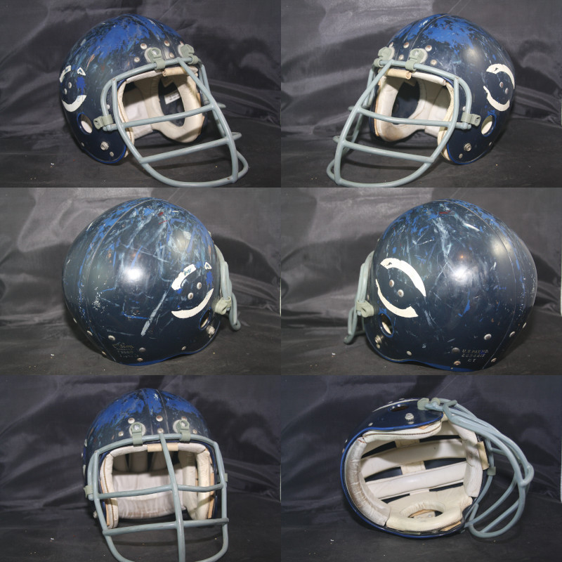 1969 Wilson F2000 Chicago Bears Game Worn Used football helmet. The helmet is complete and original as sourced to us with no modifications or alterations of any kind and shows extreme game wear to the exterior and logo decals. The helmet does not have any player identifiers inside the shell so we have not been able to attribute it to a specific player. With the extreme wear and lack of identifiers, it is possible that after seasons of game use it was relegated to a practice helmet.
