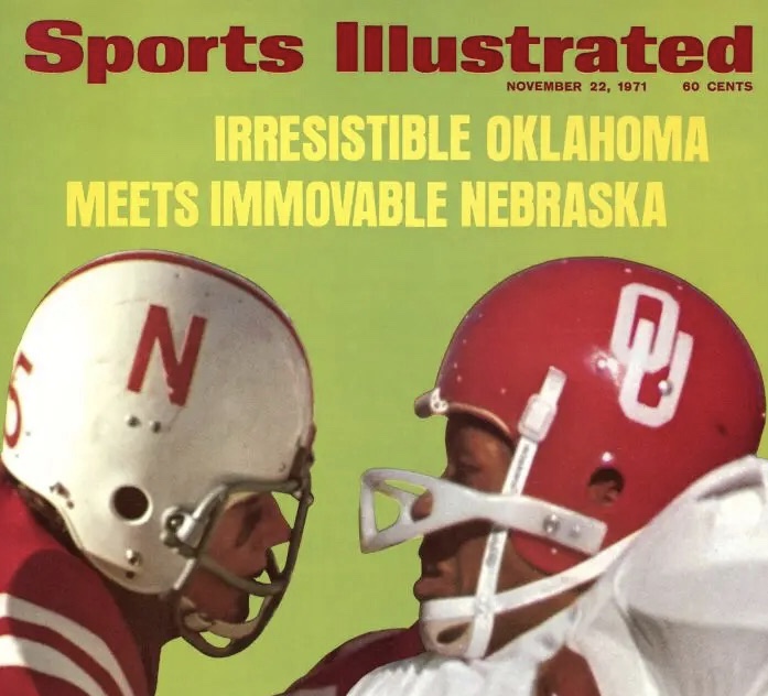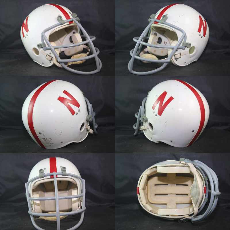 Game Used Nebraska Cornhuskers Wilson F2022 Suspension Helmet. This style of helmet was used by the Huskers from 1970 through the early 1980s. For the 1982 season Nebraska switched to a red facemask.