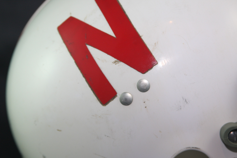 The helmet is complete including the rare Wilson chinstrap. The helmet itself shows moderate wear to the exterior and interior of the helmet. The padding is original, in great condition with some wear to the forehead area, and complete including the original Riddell Pac style vinyl jawpads. The logos are perfect and colorful, properly positioned with no issues. Old, dried adhesive can be found boarding the logos as shown in the photo below. The paint is perfect on this helmet with no issues. The facemask is a Schutt 70s style NJOP model secured to the helmet with reproduction clips, yet retaining its original zinc coated slotted hardware. An excellent, very rare model of a Huskers helmet - that you may never see another one like it.