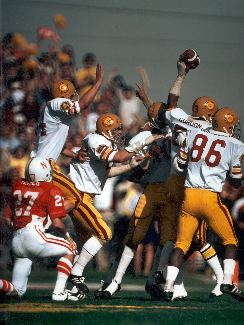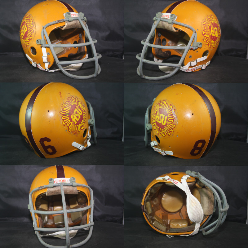 Game Worn Arizona State Sundevils helmet from the 1975-76 seasons. The helmet was worn by star defensive end Willie Scroggins. The large sized Micro Fit helmet is original, unaltered, and complete including the chinstrap.