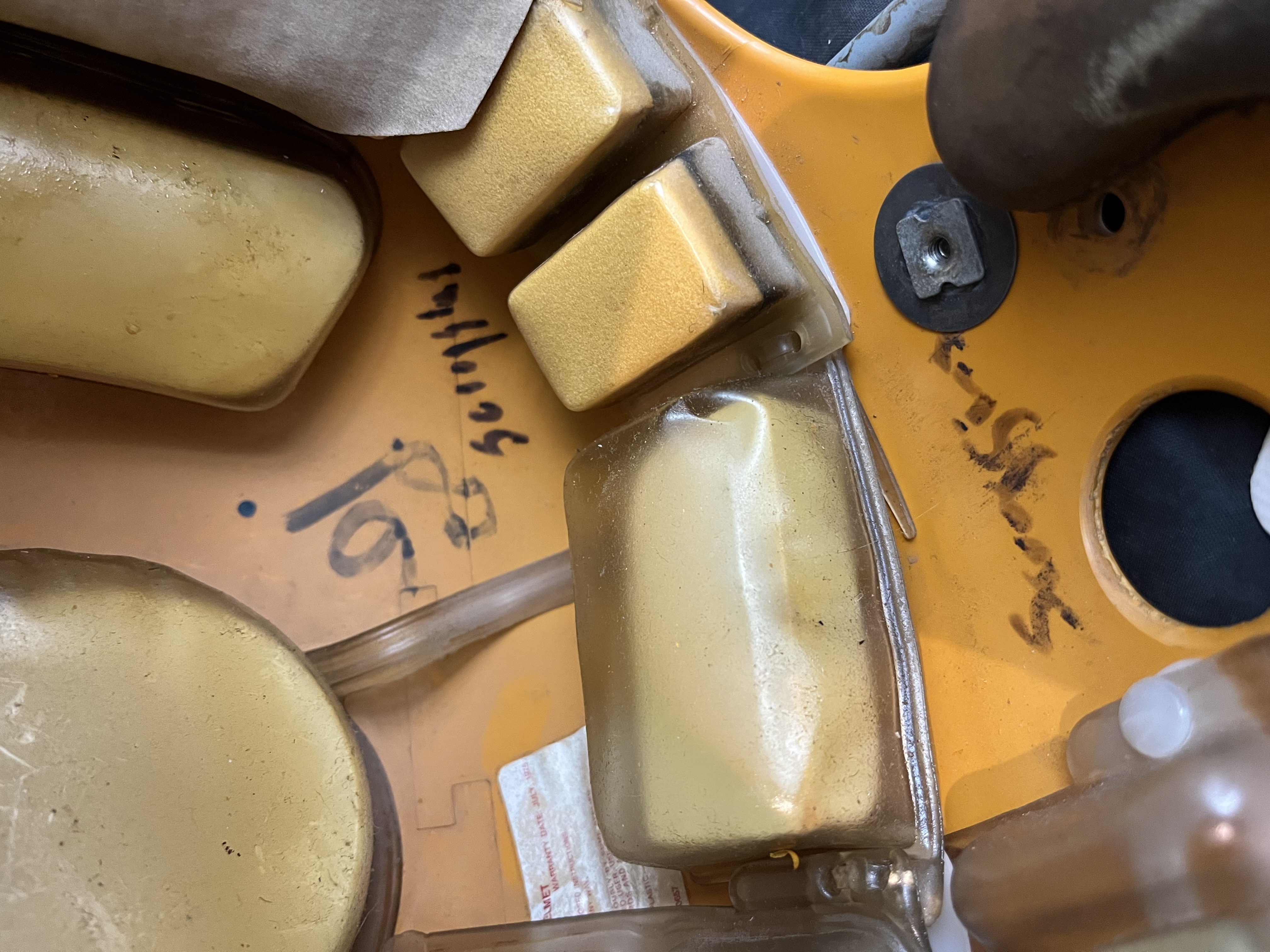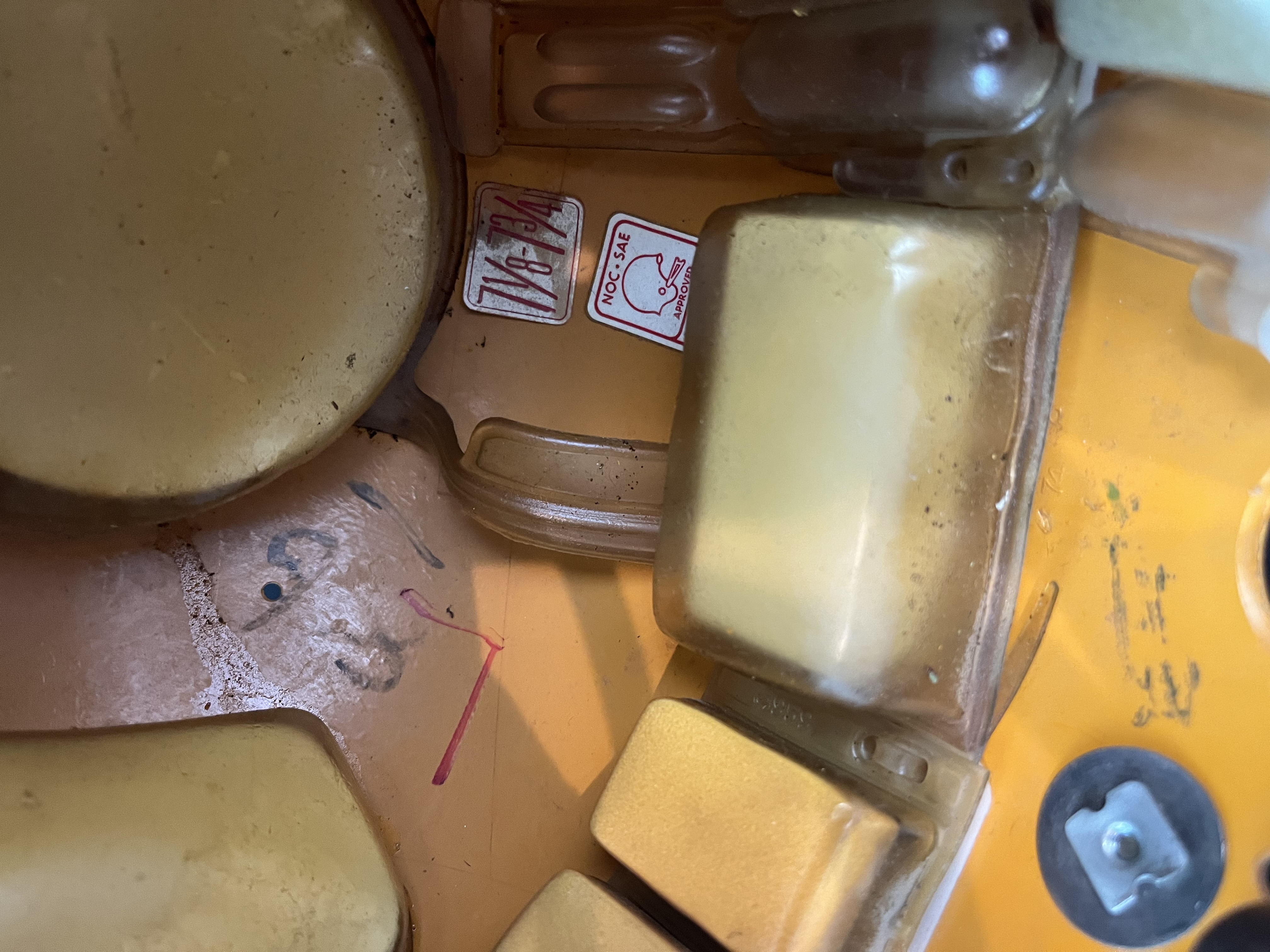 As mentioned, the helmet is a Riddell Micro Fit model helmet - with the fluid pac padding. The facemask is a an early 1970s Schutt NJOP model mask - with great wear. The mask is secured to the helmet using reproduction clips as the original clips were broken - as common due to becoming brittle over the years. The helmet retains its original screws and hardware. The helmet has its original Riddell leather jawpads, in well worn condition, yet in excellent shape with all snaps intact.