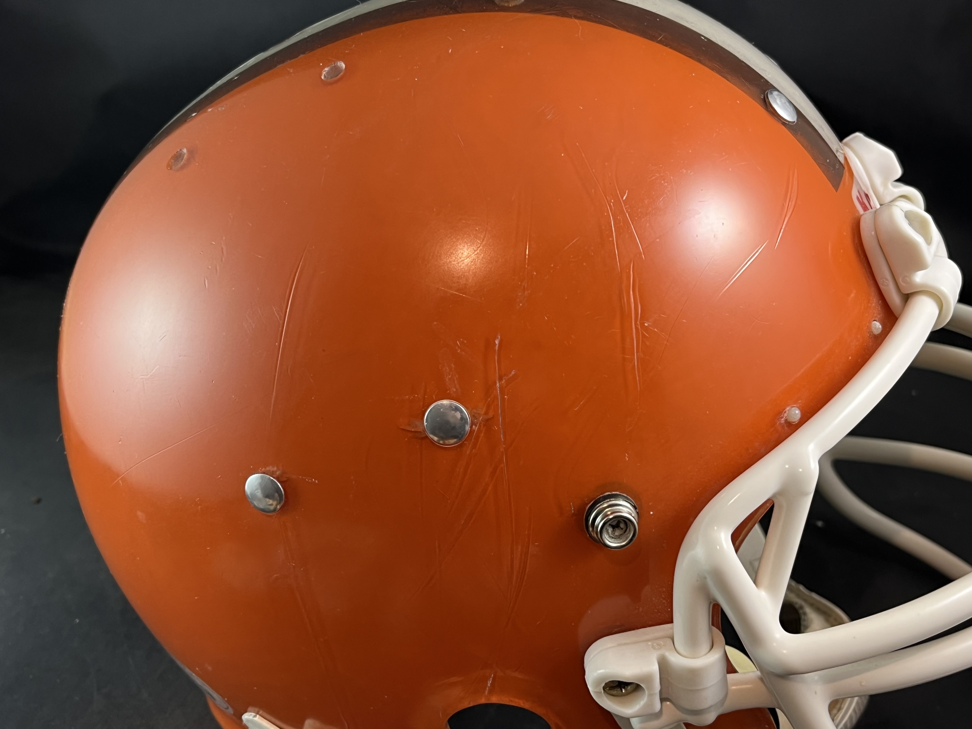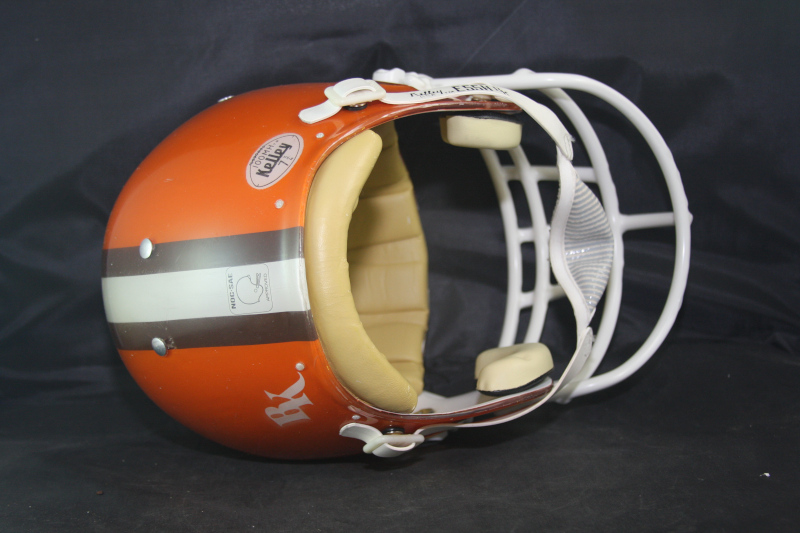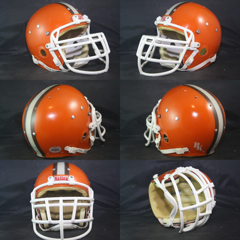 This beautiful helmet is complete including the chinstrap. The helmet itself is an original Kelley clear shell, with of course reproduced striping and custom professionally painted. The padding is original, complete including the jaw pads, and in perfect/mint condition with no visible wear or issues. The famous Brown's striping is perfect and colorful, properly positioned with no issues. The helmet is a mammouth size 7 3/4 which is very uncommon, rare, and desired in the collectors market. The facemask is a reproducton Schutt JOP-DW in the XL/Green Dot size, with no wear. The exterior shell exhibits great wear with deep gouges and scratches as shown in our photo below, adding to the display appearance of the helmet. Finally, there is a factory label, on the inside above the earhole.  .