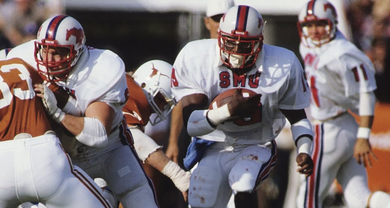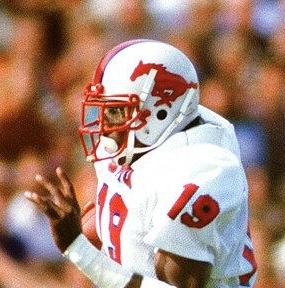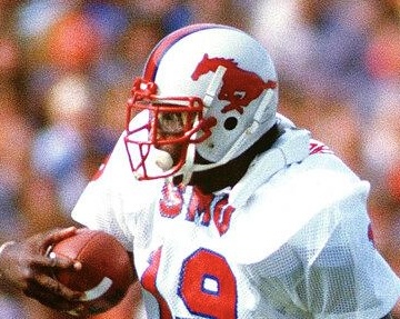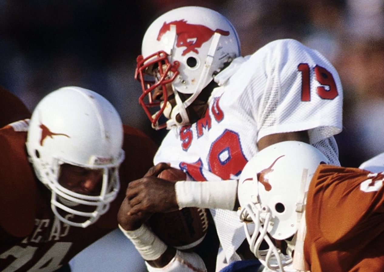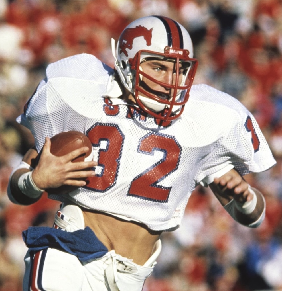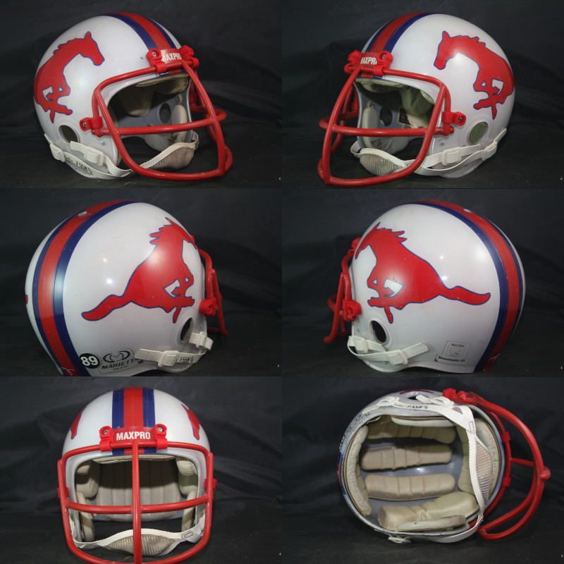Game used, very rare, worn SMU Mustangs helmet used during the 1979 season, and for seasons after. SMU used this style of helmet from 1976 through the 1986 season. This is the same model - The Kinematic 21 that Eric Dickerson wore for the Mustangs during his playing days from 1979 through the 1982 season. The helmet is original, complete, and unaltered or modified in any way.