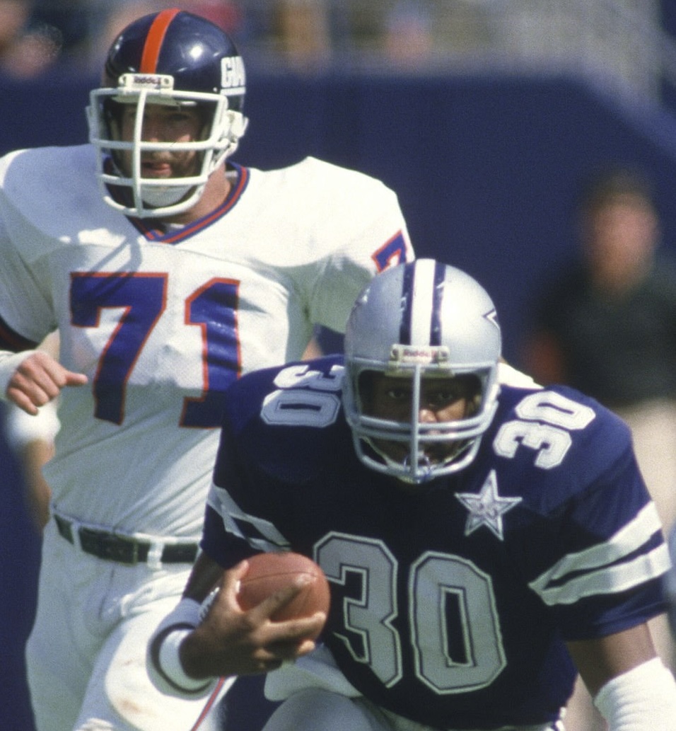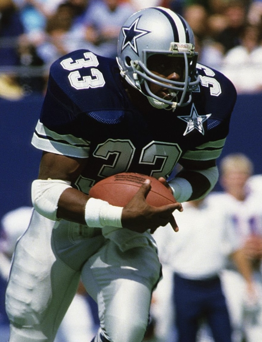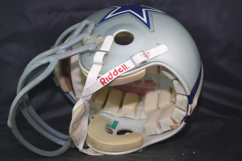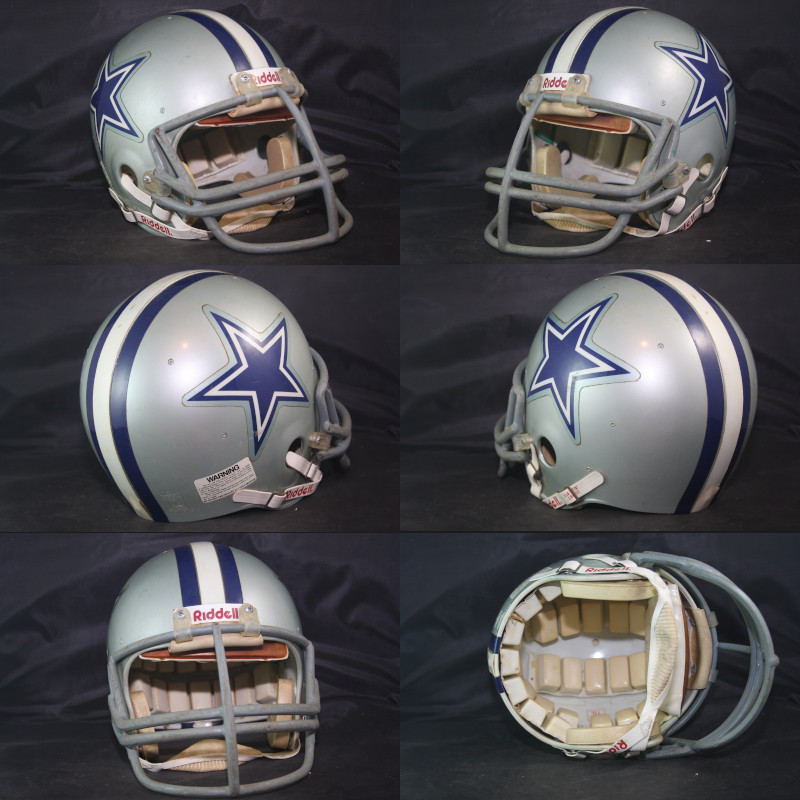 The exterior of the helmet has moderate wear with scratches, scuffs, and small paint transfers. The interior is in good condition, complete with the WD1 padding and early WD1 front pad. The striping and logo decals are in excellent condition, properly positioned, and adhered well to the helmet with no lifting. There is an All American reconditioning sticker near the right earhole of the helmet for the 1984 season. Great original helmet of "America's Team, in excellet game used condition, ready for display.