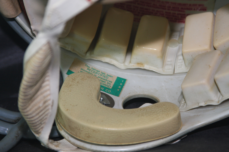 The facemask is a Schutt NOPO model from the early 1980s, showing great game wear with bare metal at the corners. The facemask is secured to the helmet using its original hardware and original Riddell clips. The jawpads of the helmet are Riddell Pac style vinyl early 80s that were typically supplied with Riddell Pac3 and WD1 helmets. The chinstrap is also an early 1980s model Riddell low mount.