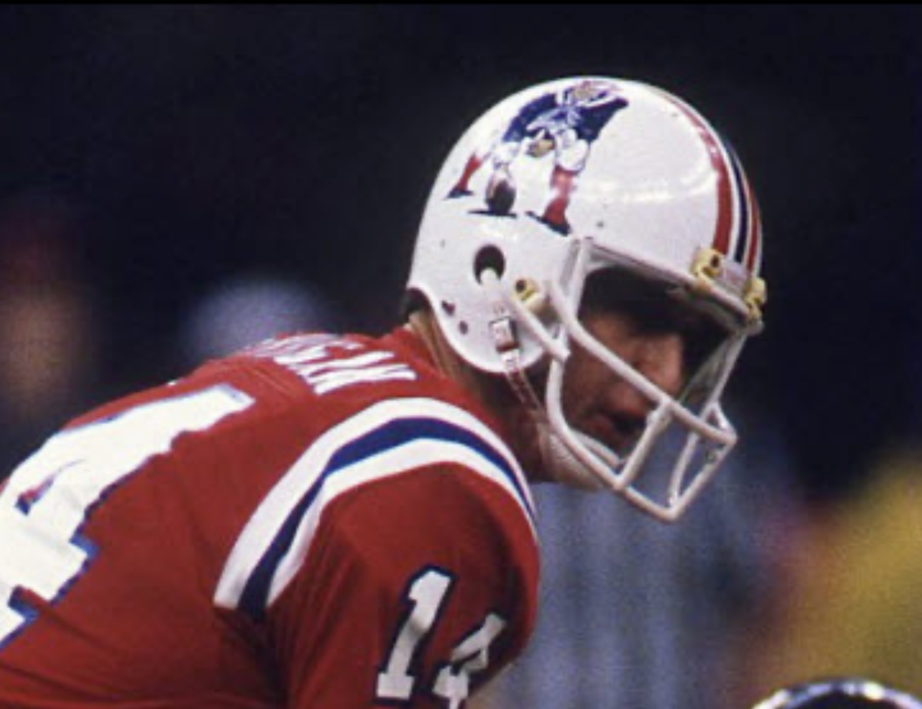 This helmet is complete with interior padding, the blue double air bladder, and the BIKE front nose bumper. The BIKE name is covered with the Patriots bumper decal as used by the team during the period. The mask is an early 80s Schutt OPO facemask - secured with original clips and hardware. The mask was modified by the Patriots equipment staff by cutting the lower bar out of the mask - thus making an OPO single wire (OPO-SW). This was a common practice with the Patriots equipment staff, and was done for star quarterback Steve Grogan as well as receivers, runningbacks, and defensive backs - see pics below.