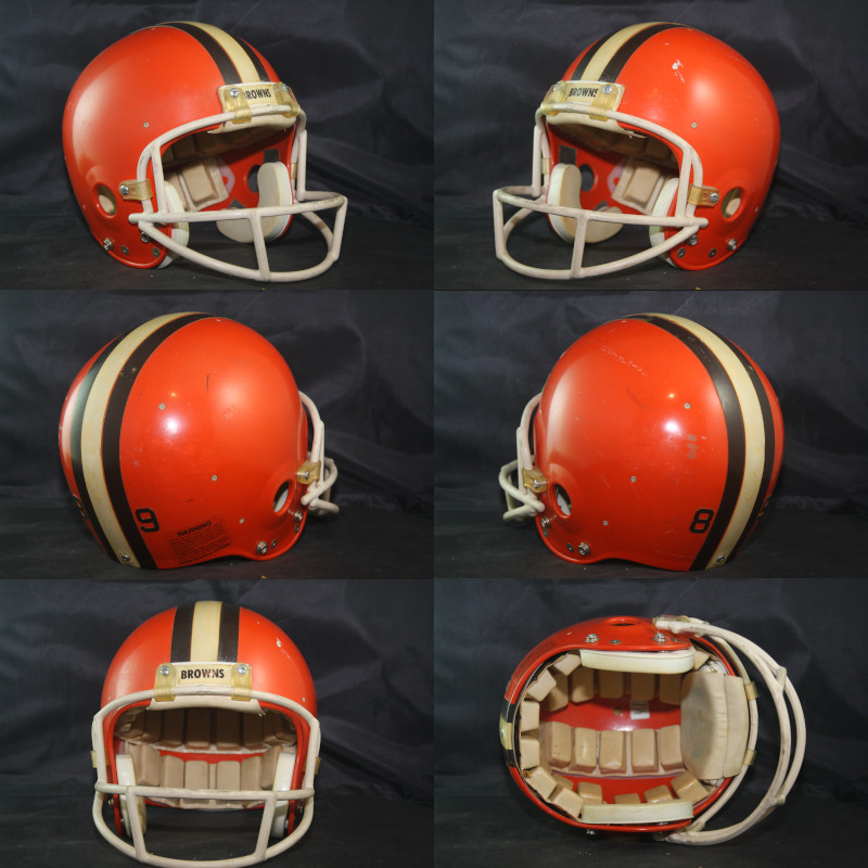 Game used helmet of Cleveland Browns wide receiver John Jefferson. Jefferson was drafted in the first round, 14th overall by the San Diego Chargers out of Arizona State. He put up staggering numbers his first three seasons with the Chargers, becoming the first player in NFL history to gain more than 1,000 receiving yards in each of his first three (3) seasons. Jefferson was 2nd team All-Pro his rookie season, and was First Team All-Pro in each of the next two seasons. After a contract dispute, he was traded to the Green Bay Packers where he teamed with James Lofton and Paul Coffman to form the finest receiving corp the Packers had ever had. After another contract dispute, Jefferson finished his career with the Cleveland Browns - playing in just seven games catching three (3) passes while wearing this helmet.