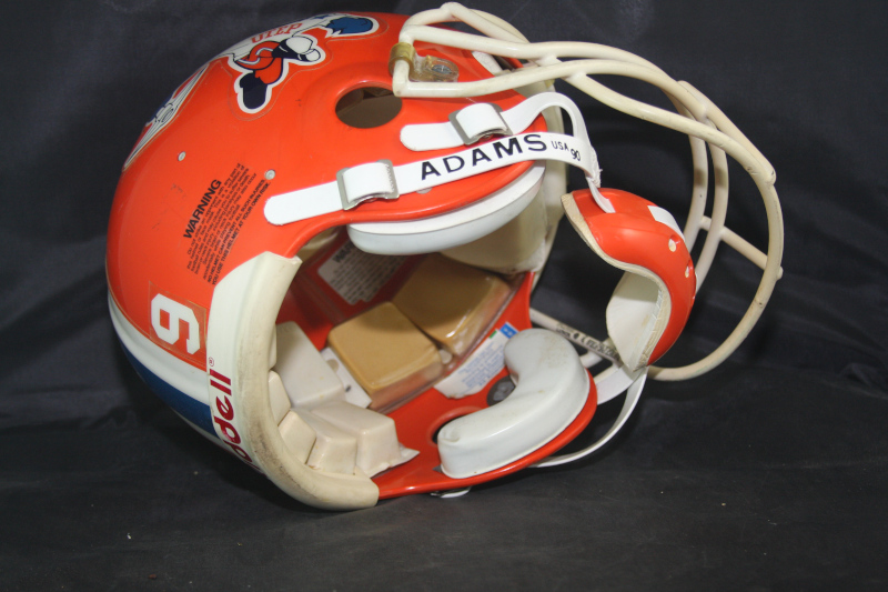 The exterior and interior of the helmet shows moderate wear. The helmet has a Schutt 1986 OPO model mask, secured to the helmet with its original clips and hardware. The logos and the striping of the helmet are positioned properly and adhered to the helmet well with no lifting. The chinstrap is a low mount Adams hardcup chinstrap with the above mentioned 1990 date code. There is a team applied #19 player identifier decals on the rear of the helmet as the Miners used during this period. The name "KING" is written on the inside of the helmet. Great helmet of a team rarely seen available. This logo is rarely seen in the collectible market as most of this small school helmets had new style logos applied to the common colored orange helmet that the team used. Don't wait on this one.