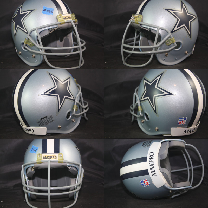 The helmet is original and complete with the fluid cell padding, Schutt NOPO facemask - dated 1990, secured to the helmet with the original facemask hardware. The striping and logos are original to the helmet, properly positioned and adhered very well with no lifting. The helmet has an original Cowboys warning label on the rear along with a proper NFL shield on the opposite rear side. Interesting to note the adhesive residue over the MaxPro name on the front nose bumper - where the white vinyl that covered the MaxPro name has either been removed or has fallen off in the more than 35 years since the helmet has been retired from potential use. The helmet remains in excellent condition with light wear to the exterior and interior. No player identifiers are marked on the helmet interior and if an external dymo-tape name existed, it has been removed as they all have on Cowboys helmets prior to their release to the public.