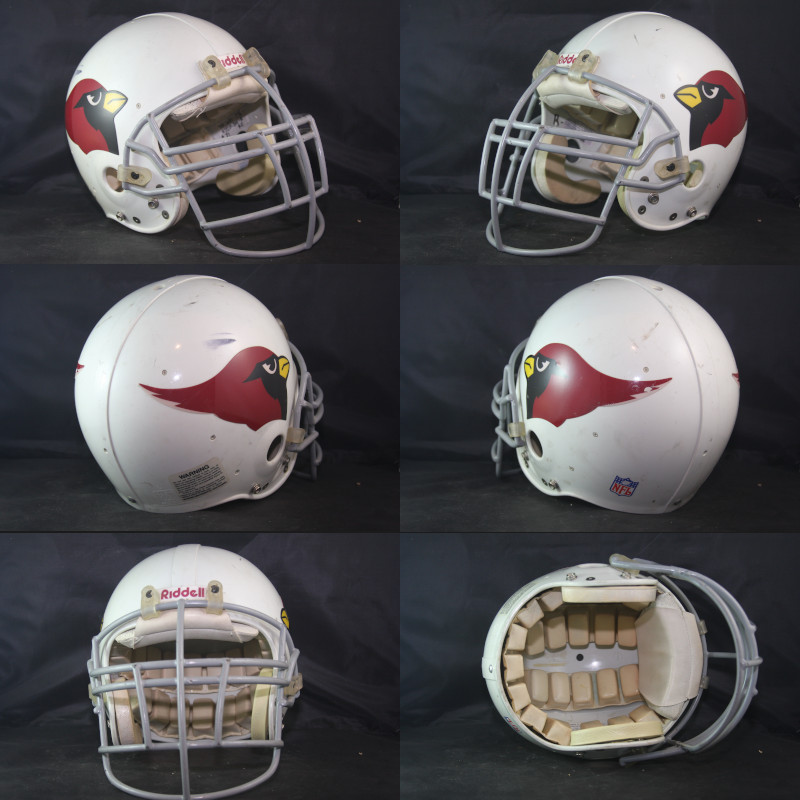 Arizona Cardinals Game Worn helmet from the 1993-94 seasons. Mark Tucker, a guard out of USC wore #71 and this helmet for the Cardinals in 1993, on the team's practice squad, and in 1994 when he played in all 16 games for the Cardinals. Tucker stayed in the area and joined the Tempe Fire Department after his playing days with the Cardinals.