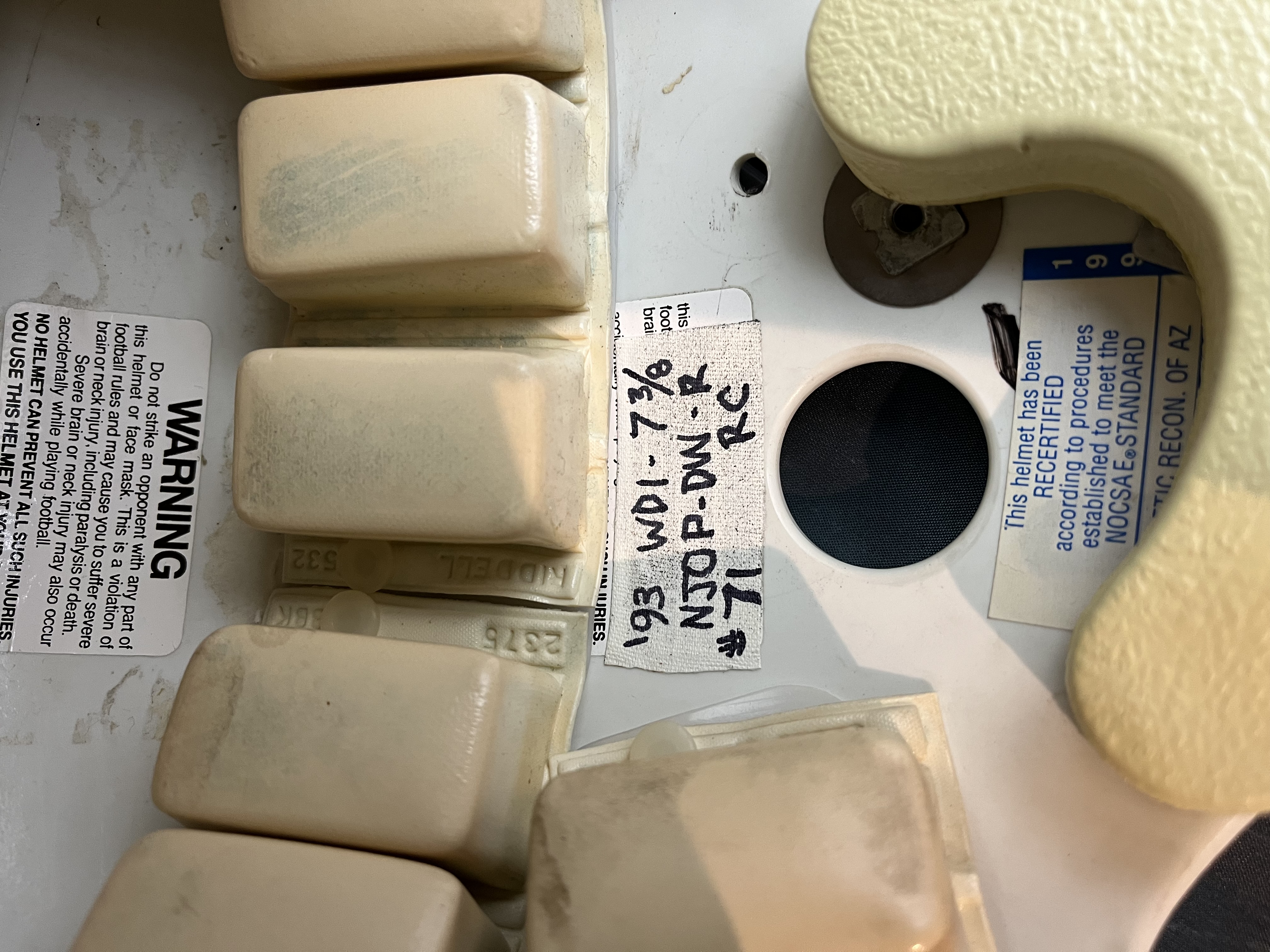 The helmet is original as sourced, unaltered, and matches examples of Cardinals game used helmets. The helmet is complete with all interior WD1 padding, including the original Riddell vinyl Pac style jaw pads. It has the original Cardinals decals on the sides, properly positioned on the helmet and adhered to the helmet very well with no lifting. The helmet has all game decals used by the team, including the NFL Shield and the team applied warning label. The helmet has a Riddell NJOP-DW model facemask, secured to the helmet with conventional clips at the top and side mounts. Finally, the helmet has a reconditioning sticker on the interior for the 1993 season from Athletic Recon of AZ, which later became Sunvalco Reconditioners.