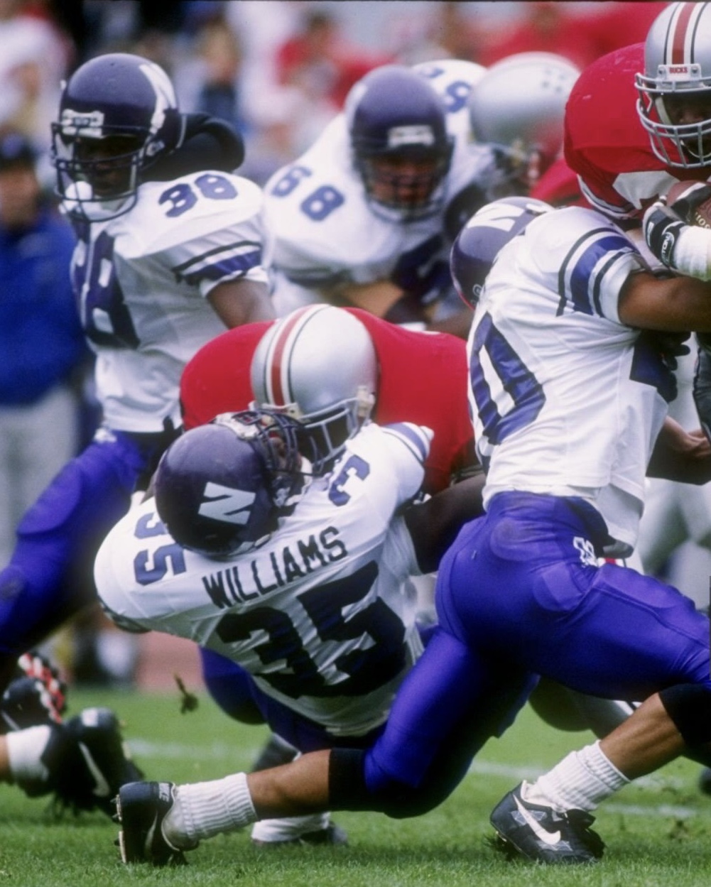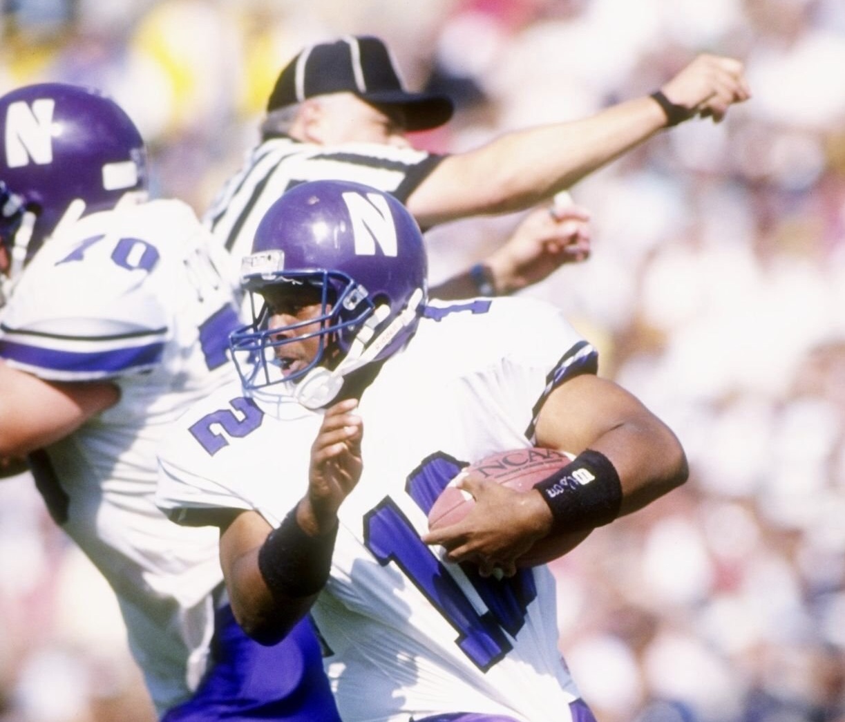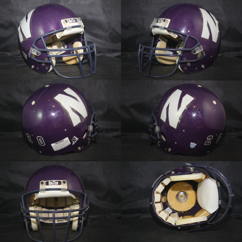 Game Used Northwestern Wildcats Riddell AF2 model helmet. The LARGE sized helmet has an original date code from 1986 with a reconditioning sticker for the 1993 season. The helmet has been worn for several seasons. Northwestern wore this style of logo decals, without the silver/gray boarder, in 1993 only, making this style, a one-year only helmet.