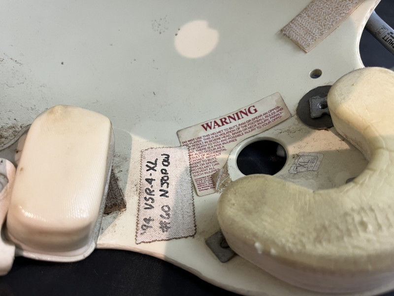The Riddell VSR4 model helmet is all original in a very large XL size of 7 7/8 - 8 3/8. The helmet was sent to their reconditioned, rejected and not returned to the team. The crown liner was removed, the helmet marked for display only and then released.