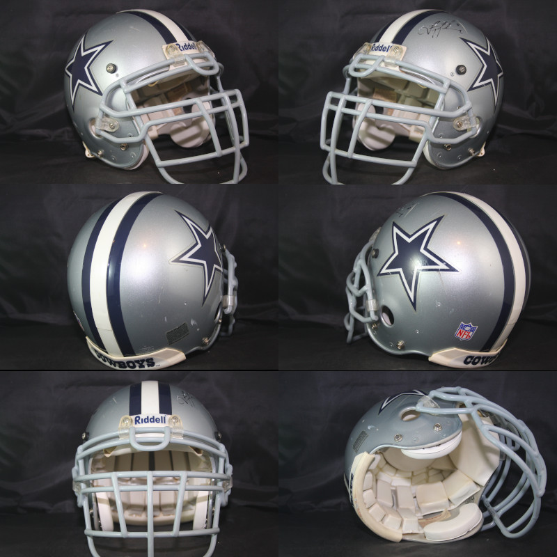 The helmet is complete except the chinstrap. It is all original and has not been modified in any way. The size of the helmet is a large 7 1/2 as the AF2 model helmet was a sized helmet. The Cowboys logos and striping is original, properly positioned, and adhered to the helmet with no lifting. Game decals include the small warning label, NFL Shield, and bumper decals on the front and rear bumpers. There is shadowing of where the dymo tape player identifier was on the rear lower portion of the center stripe, as the Cowboys have done with their helmets since the 1960s. Additionally, there is a "96" scratched/engraved on the inside of the helmet under the jawpad. I believe this to be the initial year of the helmet rather than a player identifier. Great helmet, of a highly sought after team, complete with mystery challenge, ready for your research, then for your display.