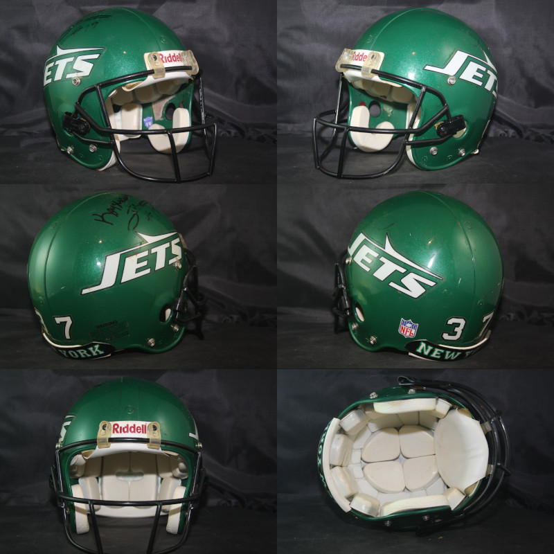 New York Jets game used helmet from the 1996 season. The VSR4 model helmet is a size large is all original and complete with a date code near the jaw pad from 1996. The helmet has its original logos on the sides, oversize warning label, NFL shield, and a #37 player identifier on the rear of the helmet. The helmet has light to moderate wear to the outside and is equally nice on the inside. The helmet has original Riddell foam early VSR4 style jaw pads that were used in the early 1990s. The facemask is a Schutt OPO-SW model with a date code of 1993. The mask is secured to the helmet with the original Schutt clips at the top mounts and original black shockblocker clips at the side mounts of the helmet. Tough helmet of a highly sought after team, with the rare metallic green paint and an equally rare thin wire single wire OPO facemask. It does not get any better!