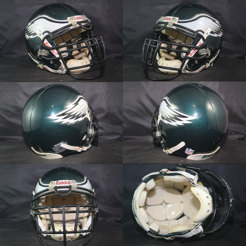 Game Worn Philadelphia Eagles helmet worn by linebacker DeShawn Fogle. The helmet is a Riddell VSR4 model in a size Large. The helmet is all original and complete with no modifications or alterations of any kind. The facemask is a Schutt RJOP-UB-DW model in carbon steel mounted with Schutt clips at the top and on the sides. The chinstrap is a rare model - an Adams Pro 100, with the Riddell brand printing on all four traps. Additionally, the straps are sewn at the D-rings rather than riveted as later models of this strap. The chinstrap is secured at the top mounts with screws, and conventional buckles at the bottom mounts.